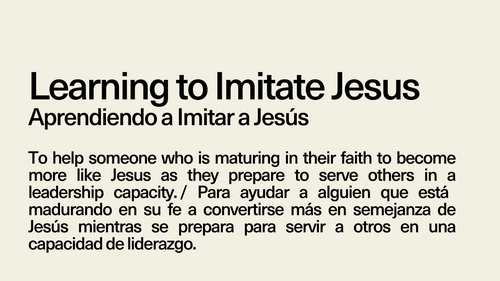 Discipleship is a lifelong journey of following Jesus Christ, learning from His teachings, and living in a way that reflects His love and truth. El discipulado es un viaje de toda la vida siguiendo a Jesucristo, aprendiendo de Sus enseñanzas y viviendo de una manera que refleje Su amor y verdad.